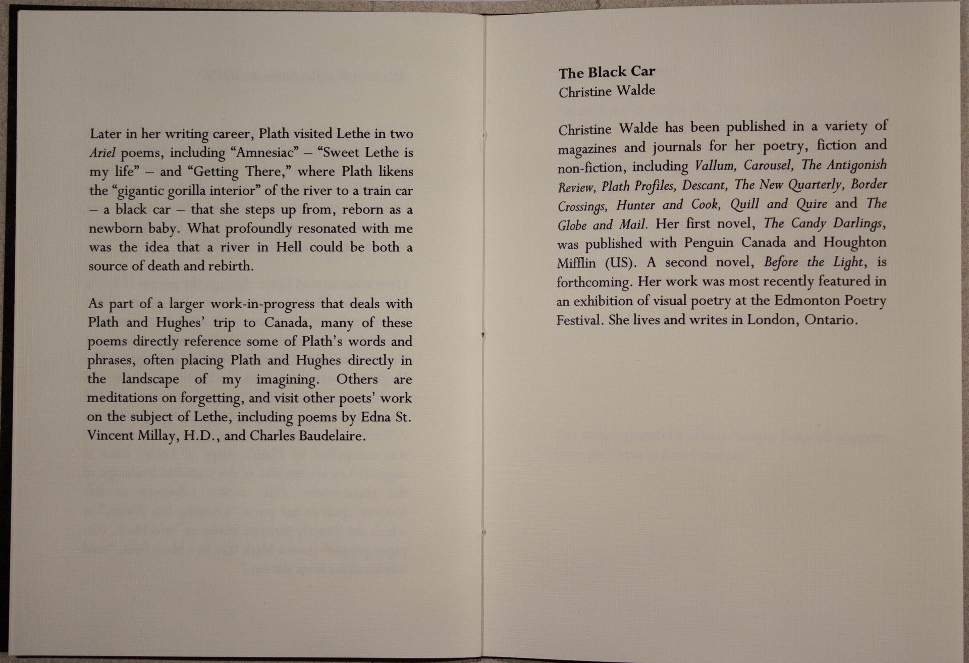 Inspired while doing archival research in the Plath archives at Smith College and Indiana University, The Black Car is part of a larger finished manuscript that contends with Plath and Hughes’ trip to Canada. Others are simply meditations on forgetting, and visit other poets’ work on the subject of Lethe, including poems by Edna St. Vincent Millay, H.D., and Charles Baudelaire.